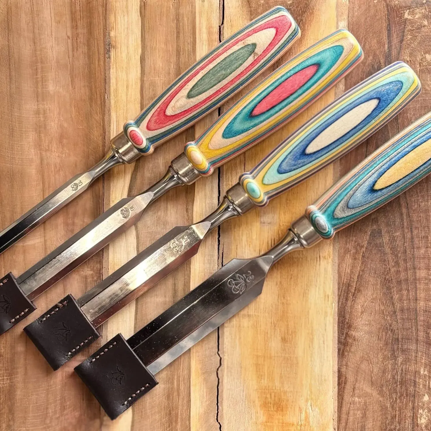 Il y a les outils bien sages, et puis il y a ceux qui racontent quelque chose. Ce set Kirschen « Woodworking Is Not A Crime » appartient clairement à la seconde catégorie. Les manches proviennent d’anciens skateboards, récupérés, assemblés puis tournés à la main. Chaque pièce est différente, avec ses stries colorées et ses traces de vie passée. Un bout de bitume qui finit à l’atelier, et qui reprend du service autrement.