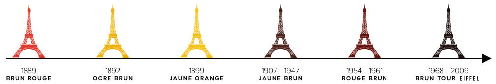 Lors de mon inauguration elle était rouge Venise, (dommage pour vous que la photo couleur n’existait pas à l’époque) ensuite mes couleurs ont été ocre brun en 1892, Jaune orange, décliné en 5 teintes en 1899, puis jaune brun de 1907 à 1947 et enfin rouge-brun de 1954 à 1961 avant d’adopter le brun Tour Eiffel en 1968, encore utilisé de nos jours.